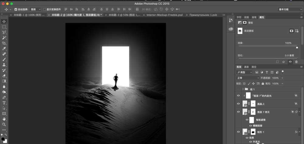2、接着确定光门的位置,用矩形工具画完用蒙版工具擦去遮盖的部分。给光门增加一丢丢外发光。