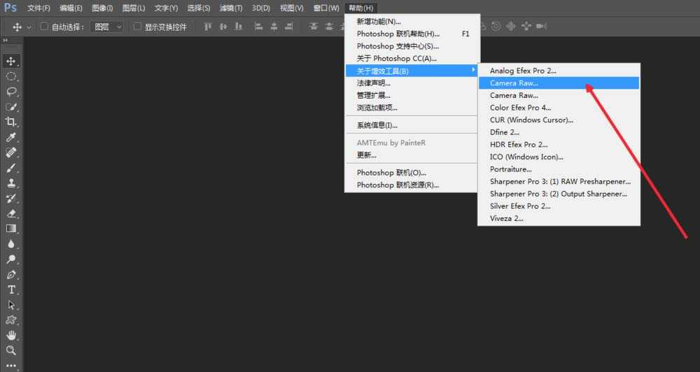 2、了解PS6 ACR的版本,打开PS点击帮助,点击增效工具,点击camera Raw即可。