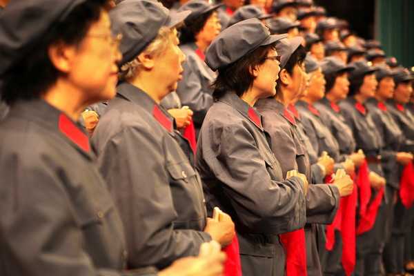 拍摄退休职工身着红军服表演的舞台照片,从舞台侧面使用长焦镜头配合大光圈,选取其中的演唱者物进行对焦拍摄