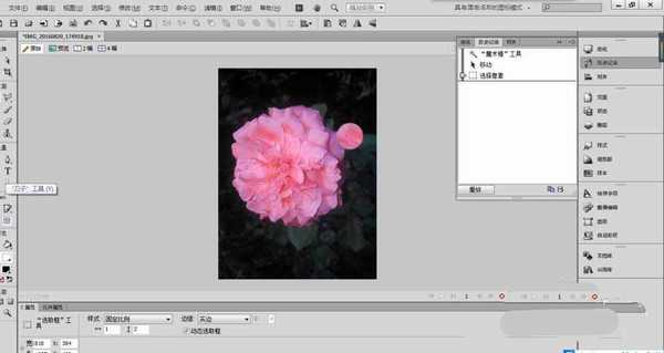 1、按照第一教程老师所讲的1-8魔术棒进行操作,导入图片,点击魔术棒按键与边缘黑色区域图片如下。未出现向日葵图片中的虚化边框。此时根本分不清你选取的颜色相近的区域以及你是否进行了此项操作,仅能从历史记录中查看。