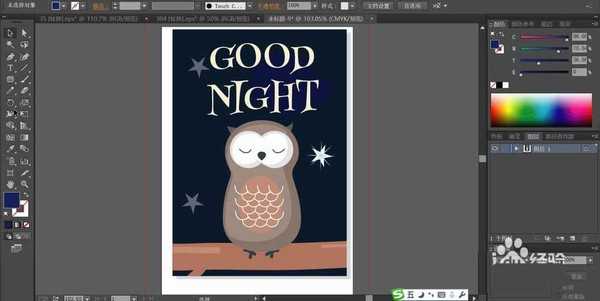 1、使用钢笔工具画出画面的主要元素猫头鹰的细节元素,再画出长长的枝条,还有文字的字体选择与变形处理,背景上面的星星的摆放。