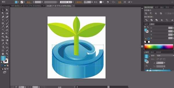 4、我们用绿色的渐变填充这个小树苗下方的茎秆,用蓝黑色的渐变填充字母的中间路径,用滤色效果来呈现字母边缘的高光区域。高光区域用半透明的蓝色渐变填充。