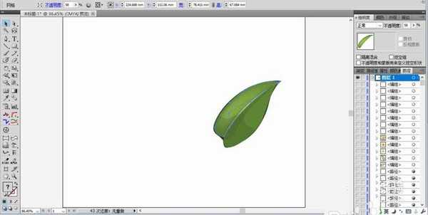 3、在叶片的左侧,我们绘制出半片叶子的路径,用网格工具做出渐变的绿色效果并填充。在叶子的下方继续绘制出一个暗光区域路径并用半透明的绿色填充。