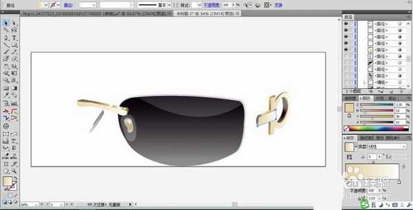 4、继续绘制镜片的右侧的框架路径,我们画出字母造型的框架再填充金色的渐变到顶端,再填充淡黄色到正面路径。